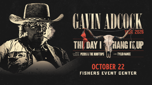 Country music rising star Gavin Adcock will bring his 2026 headline tour to Fishers this fall. Adcock’s “The Day I Hang It Up Tour 2026” is scheduled to stop at the Fishers Event Center on Thursday, October 22, with special guests Pecos & The Rooftops and Tyler Nance also on the bill.