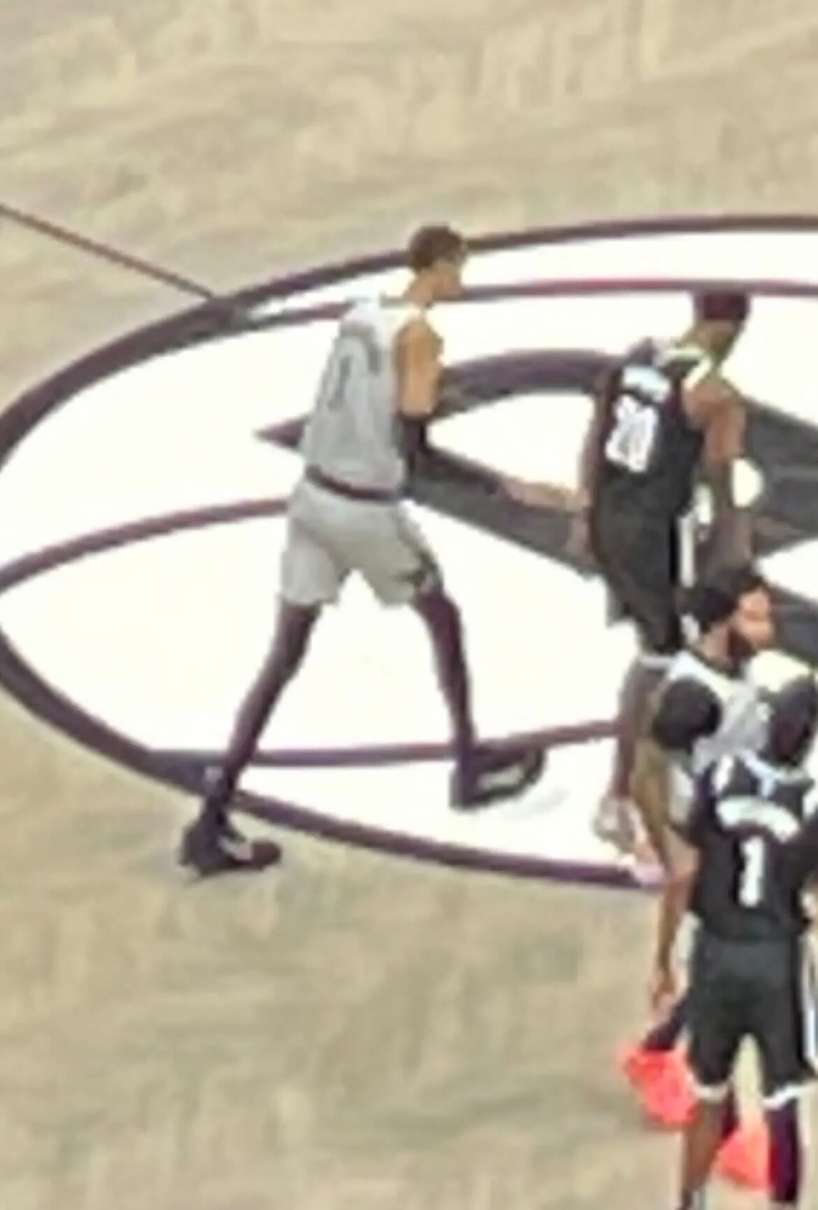 When watching a Spurs game on television, you can tell that Wembanyama looks so physically different than any other basketball player on the court, and I can confirm firsthand that the effect is not diminished when sitting in the upper level of Brooklyn’s arena. Even in a shitty photo on an older phone, you can tell that something’s off. I snapped a couple of pics during the game for my own memory, and in one of them, Wembanyama resembles some sort of positionless cryptid.